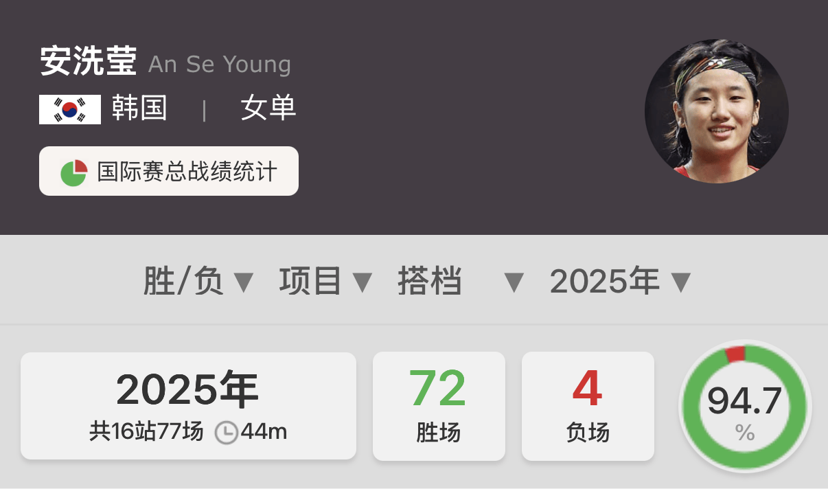 安洗莹:94.66%(71胜4负,2025)(截至目前)