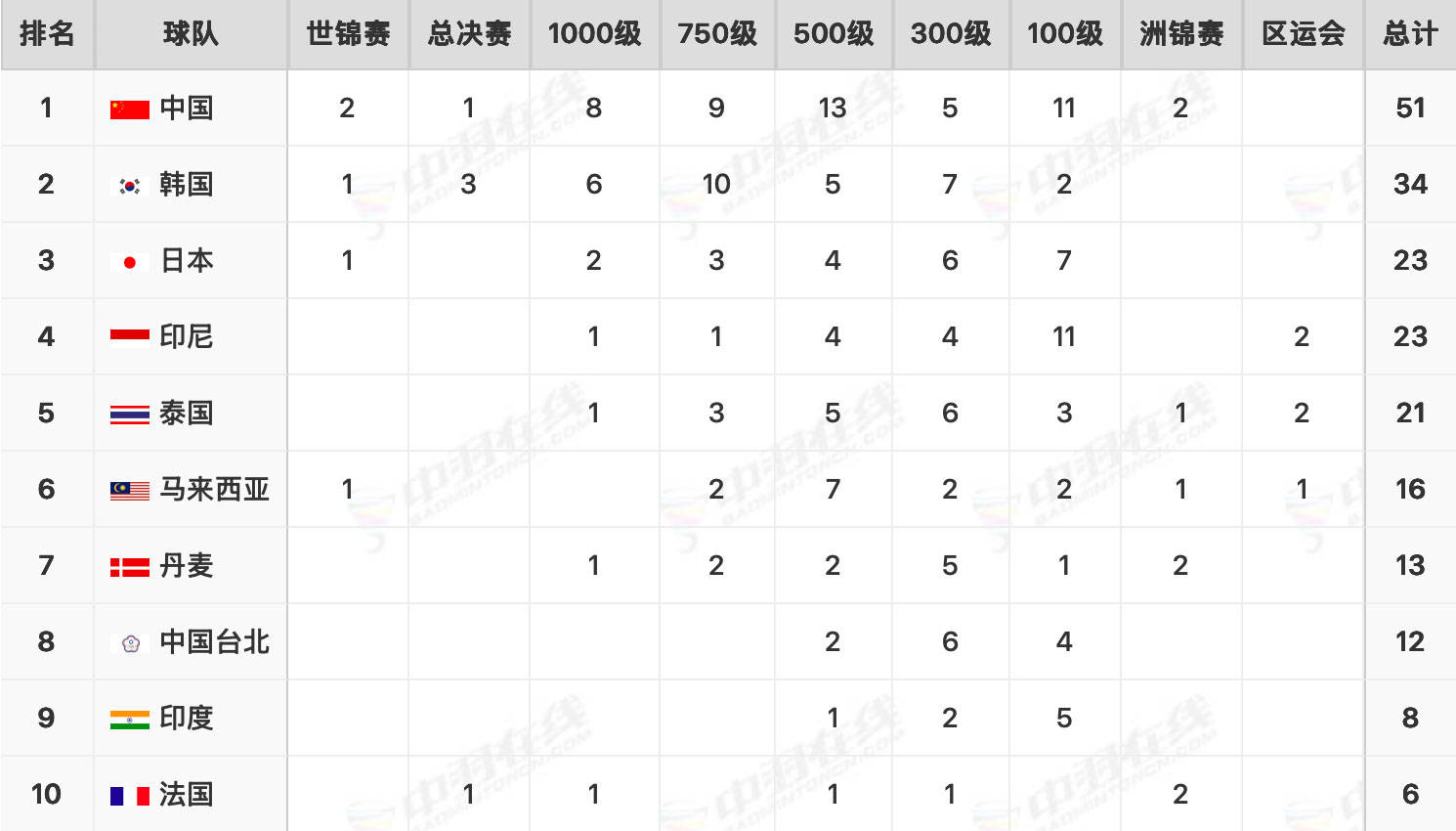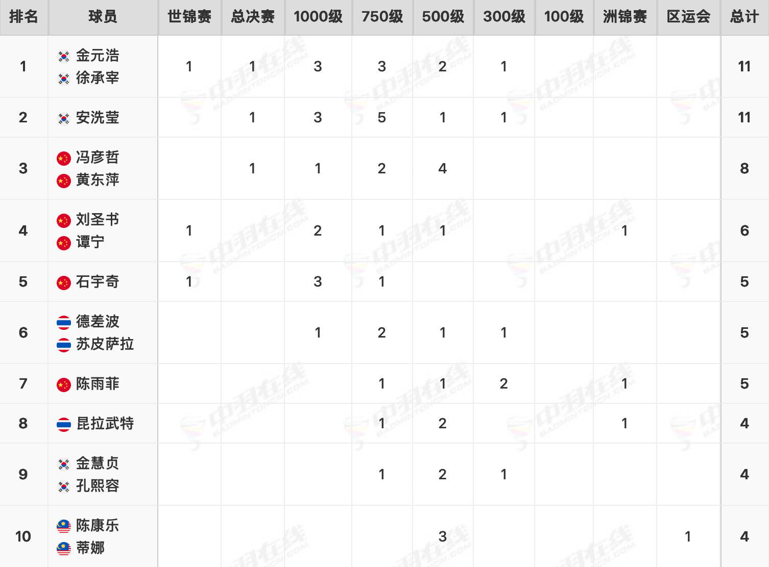 12月21日,随着年终总决赛落幕,世界羽联巡回赛2025赛季全部比赛结束,冠军统计榜单随即出炉,在球队榜国羽以51枚金牌高居榜首,球员榜则由韩国的金元浩/徐承宰(个人12冠)、安洗莹各夺得11枚金牌包揽前二。