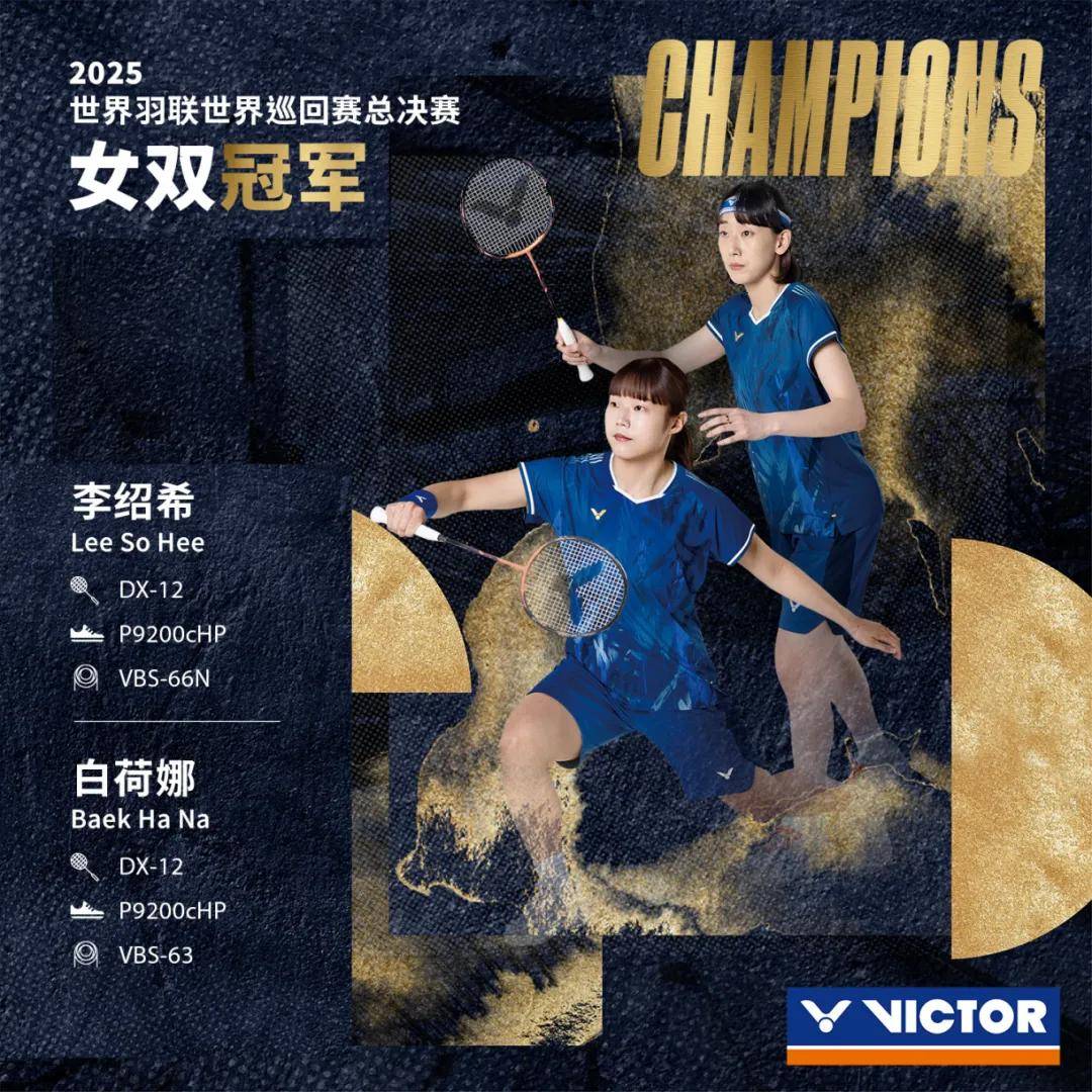 2025世界羽联世界巡回赛总决赛圆满落幕,VICTOR签约球员李绍希/白荷娜夺得女双冠军。VICTOR作为官方器材合作伙伴,为总决赛提供比赛器材和专业服务,呈现年终羽球盛宴更多精彩。