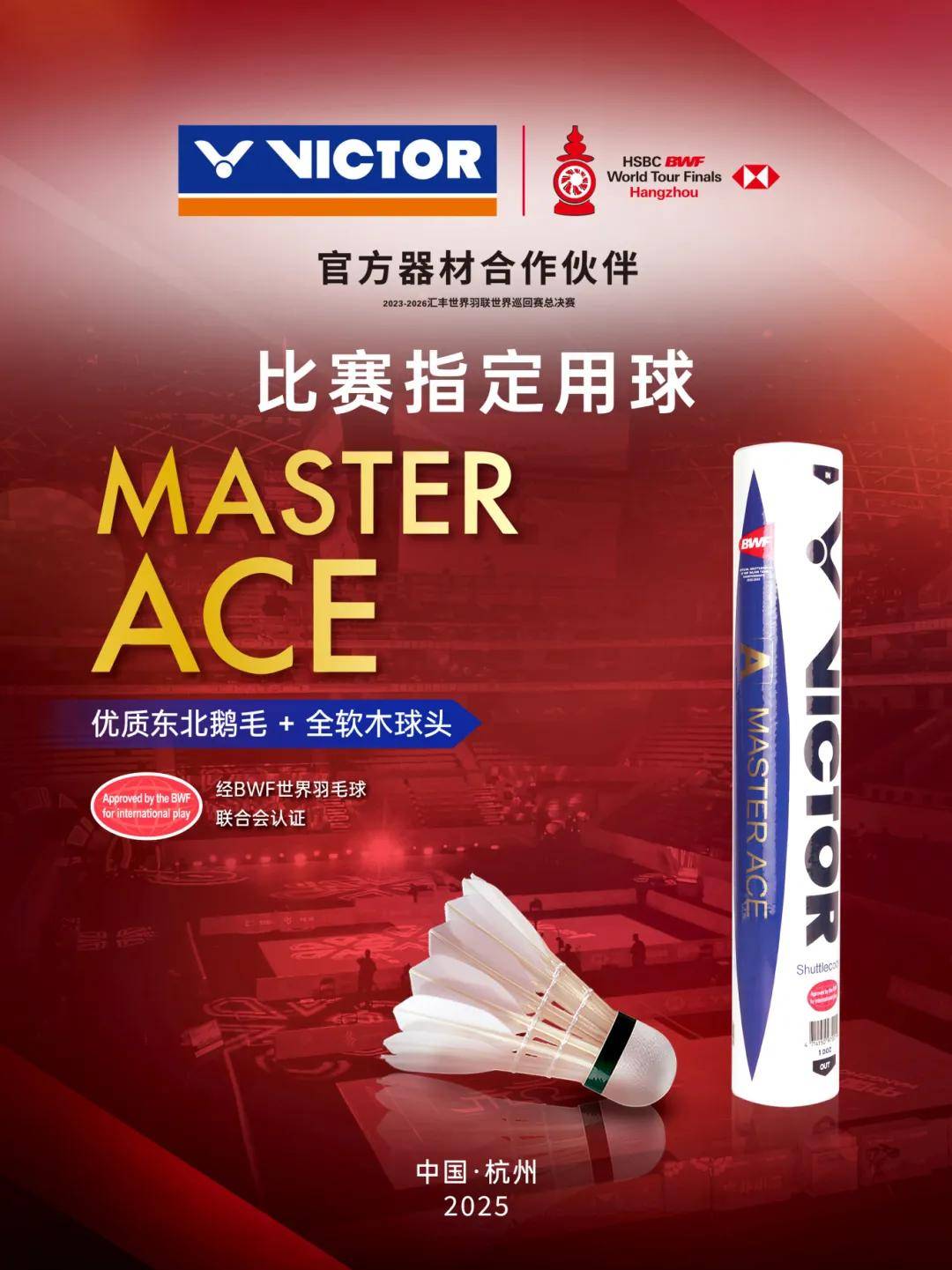 本次比赛用球采用的是VICTOR的MASTER ACE。MASTER ACE采用精选优质鹅毛以及天然全软木球头,凭借扎实的打感、准确的落点以及良好稳定的飞行性能,获得了参赛选手的认可。赛事期间,MASTER ACE总决赛纪念装热销,更多球迷感受到比赛指定用球的魅力。
